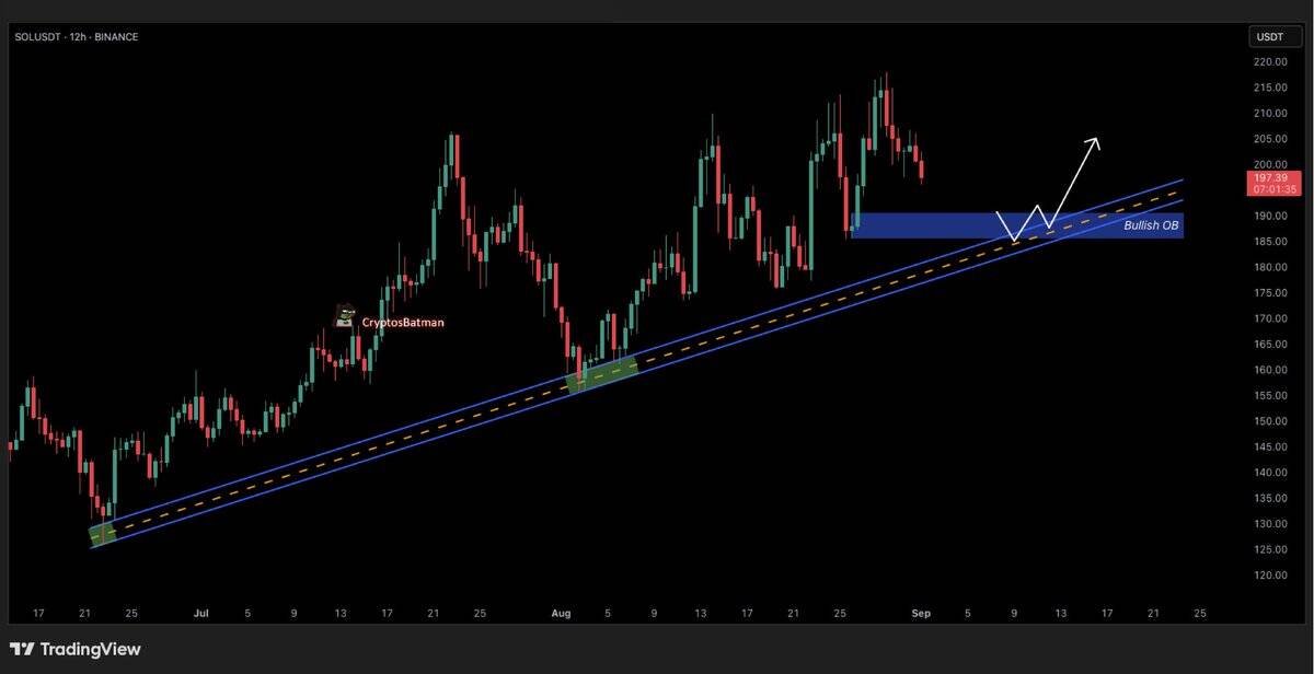 A separate chart from CryptosBatman shows that SOL may approach a key zone between $185 and $190. This area has previously acted as a base for upward moves and also lines up with an ascending trendline that has held since July.