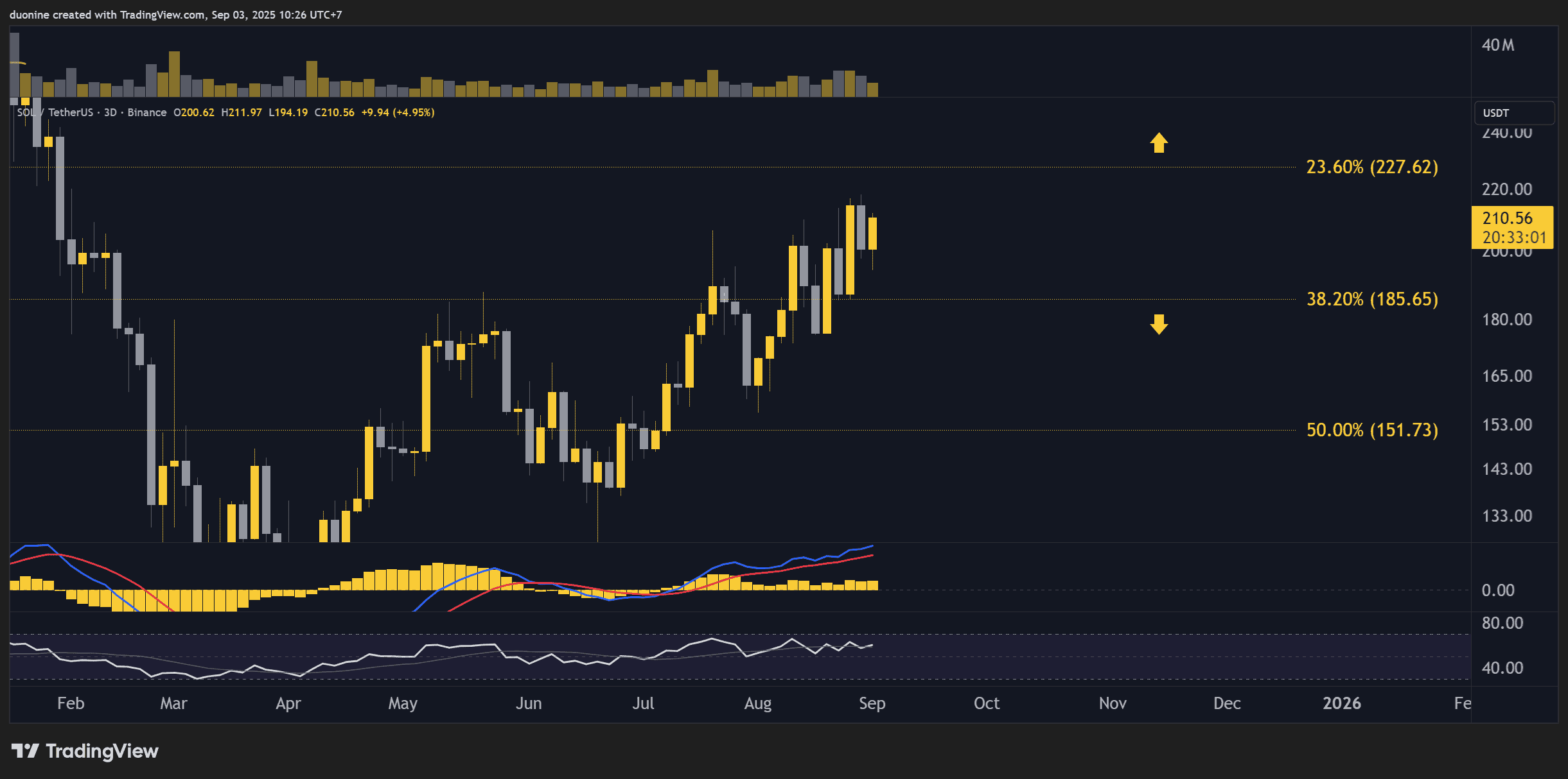 While market leaders such as Bitcoin or Ethereum are in a correction mode, Solana has consistently made higher highs since early August. This has allowed it to consolidate the support at $185 and allowed buyers to aim for the key resistance at $227. At the time of this post, SOL is found at $210.