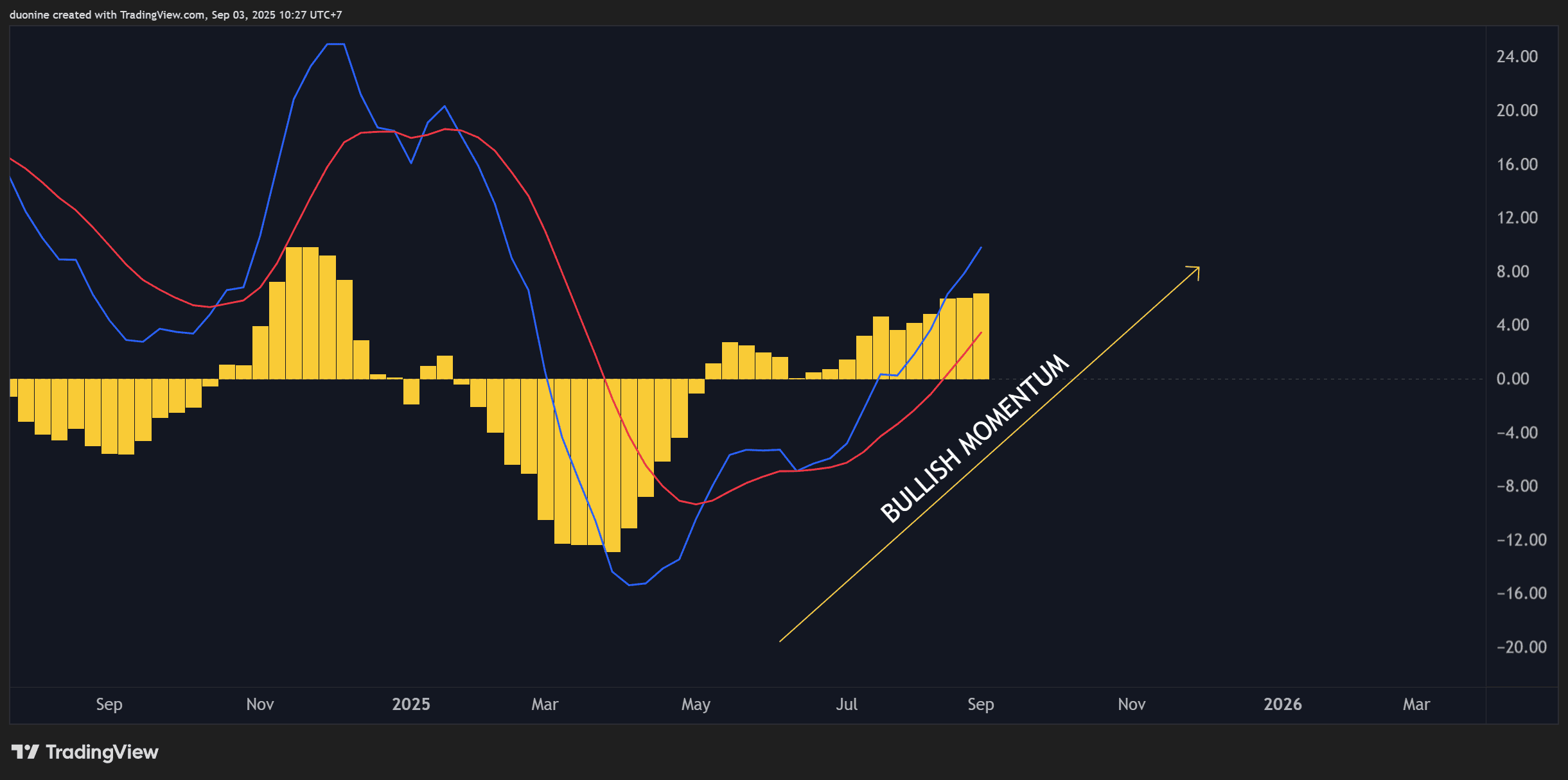 The weekly MACD shows a clear uptrend with the histogram making higher highs. The moving averages are also expanding, which indicates that the bullish momentum is intensifying. This is likely to continue until the key resistance at $227, where sellers could return.
