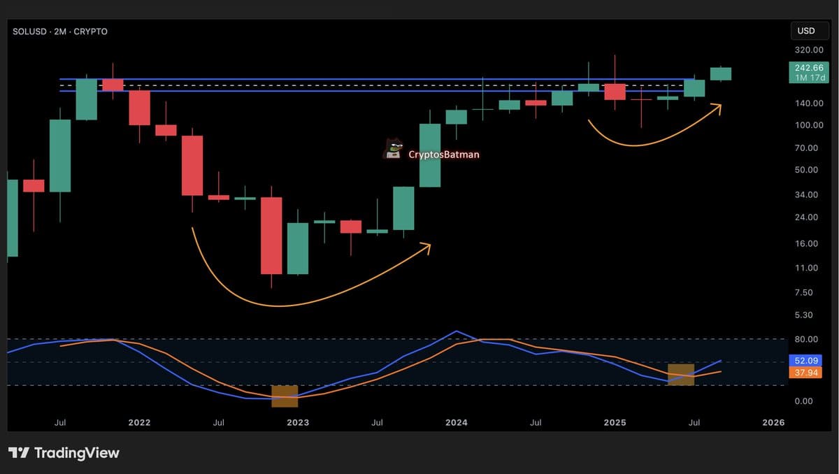 Notably, the Stochastic RSI on the same chart has also shown a golden cross, with the %K line moving above the %D line. This is the second time this crossover has appeared on the 2-month timeframe. The last time it occurred, SOL was trading near $14, followed by a strong upward move to around $250.