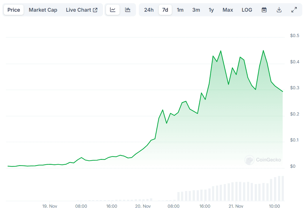 Its market capitalization soared from approximately $20 million on November 19 to more than $450 million several hours ago. Shortly after, the figure headed south, and as of the time of this writing, it stands at roughly $300 million.