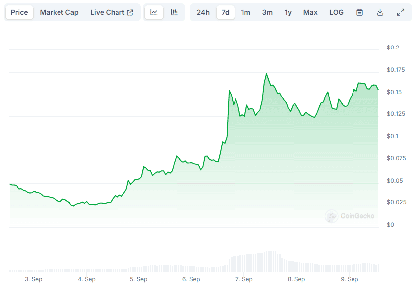 The meme coin, which saw the light of day earlier this summer, saw its price skyrocketing by approximately 250% in the past seven days. It currently trades at around $0.15 (per CoinGecko’s data), while its market capitalization is well above $150 million.