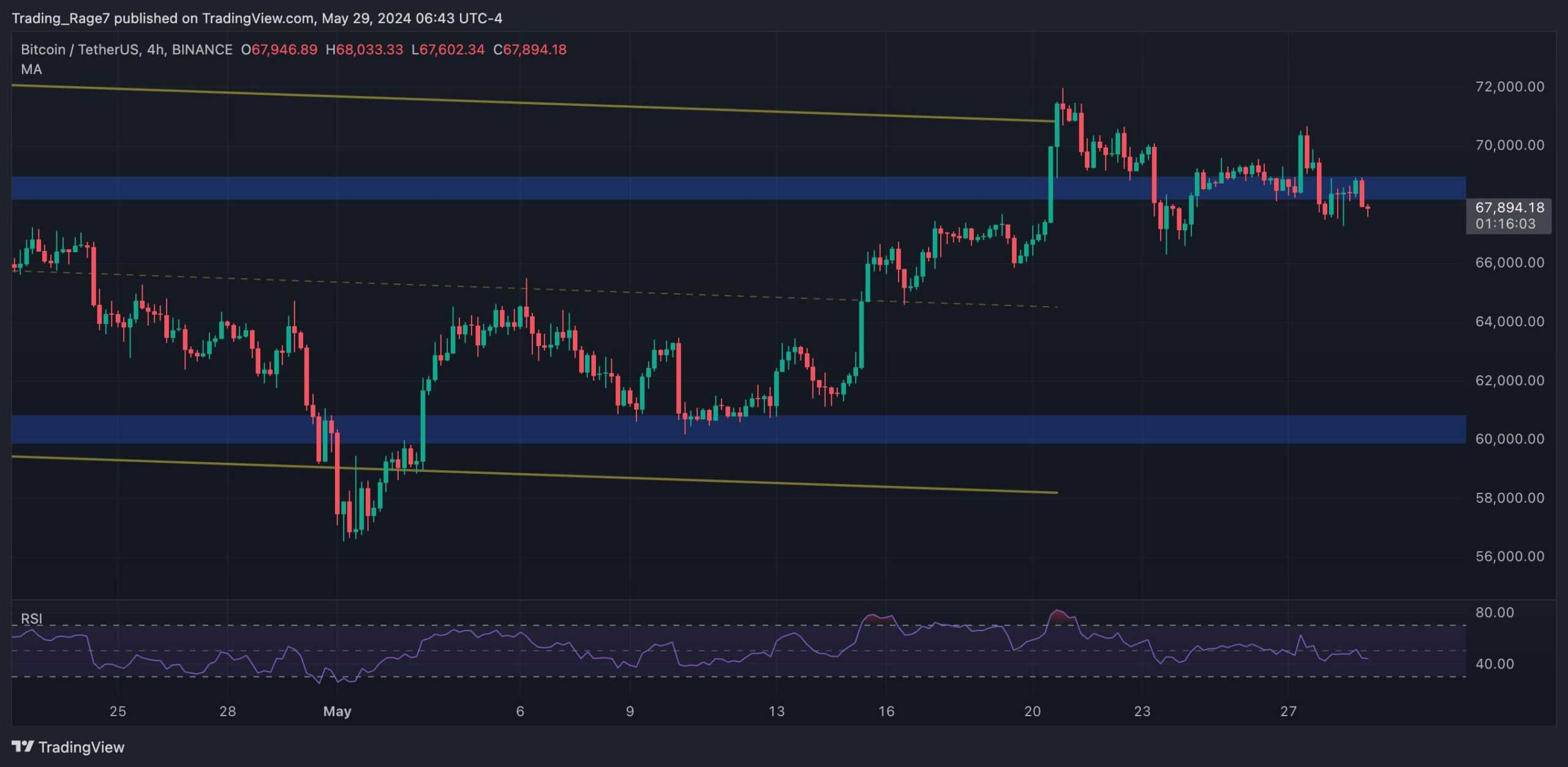 Looking at the 4-hour chart, the price is currency hovering around the $68K level, failing to keep its upward momentum. The Relative Strength Index also oscillates around the 50% threshold, indicating that the market is still indecisive.