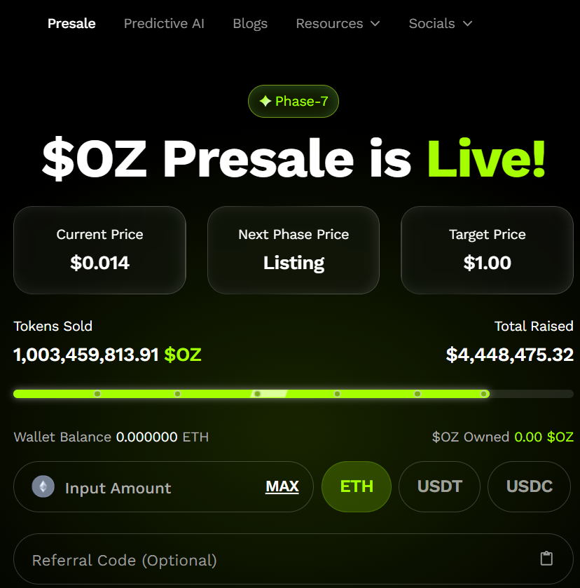 Ozak AI tops the list as a next-generation project blending AI and blockchain. It takes the presale market by storm. In phase seven, tokens cost $0.014 each. The project raised over $4.44 million. It sold more than one billion tokens. That shows investor interest picking up speed. Ozak AI uses predictive analytics, real-time data modeling, and autonomous trading tools. These bring institutional-level yield to blockchain markets. The partnership with Dex3 improves liquidity handling. Weblume integration lets AI dashboards fit smoothly into DeFi platforms.