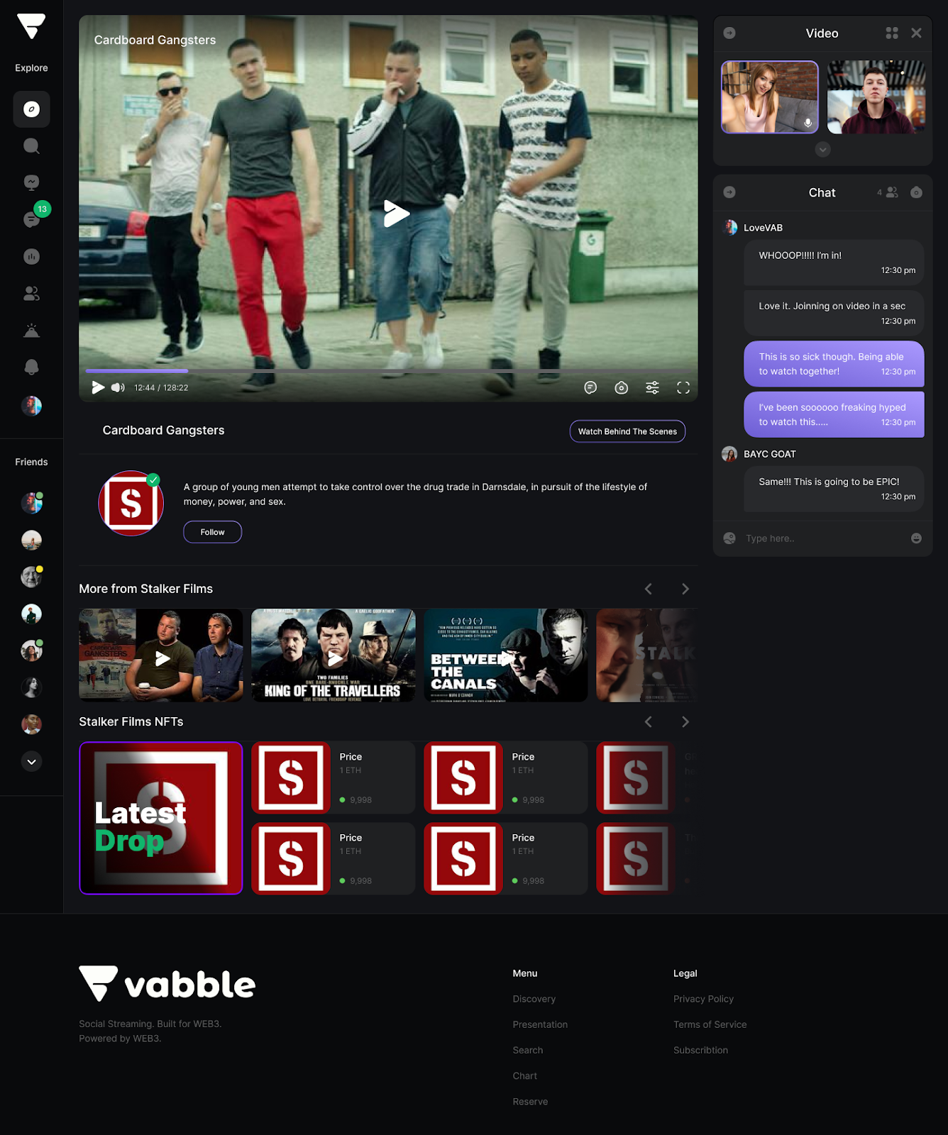 Once content passes through governance, it is distributed to Vabble’s streaming service, which is a hybrid of Snapchat and Netflix, highlighting their focus on engaging younger generations. Rather than launching another Netflix clone, Vabble has combined social and streaming features, allowing people to watch movies together over video calls or text chat in a smooth and seamless experience.
