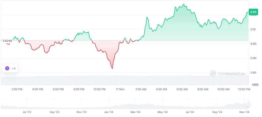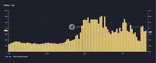 Data from Artemis shows that daily active addresses peaked in September 2024. This was fueled by the rise in the price of its native coin, SUI, which reached an all-time high of $2.36, propelling its market capitalization to nearly $4.9B. Since then, the token has risen even further to a peak of $3.3 in November 2024.