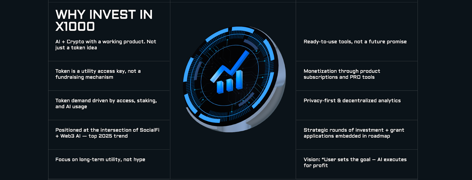 Let’s be blunt: there are plenty of trading platforms. So why X1000? Plenty of projects talk about automation and AI. Few actually deliver tools that are usable right now. X1000’s main advantage is speed, thanks to its hybrid design. Add to that its flexibility across multiple blockchains and a transparent set of smart contracts, and you have a platform that stands out in a space where buzzwords often outweigh results.