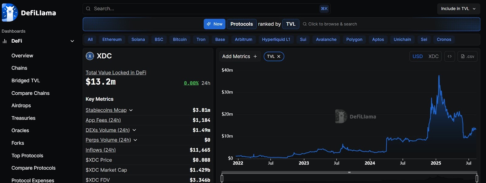 Beyond validator staking, the ecosystem has expanded into DeFi and liquid staking solutions. DeFiLlama reports an additional ~142.39 million XDC (around $13.1 million USD) locked in protocols enabling yield farming, lending, and other capital-efficient strategies. Platforms such as PrimeStaking now lead the segment, with over $6 million in locked value.