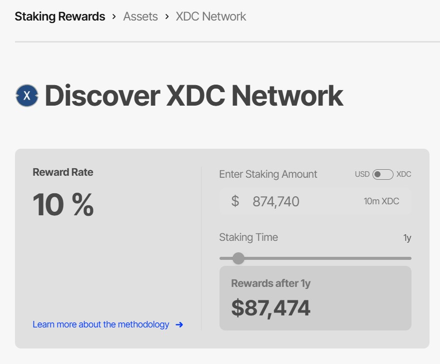 According to StakingRewards.com, XDC currently offers an estimated 10% annual percentage rate (APR) for validators. A masternode requires a locked stake of 10 million XDC (about 874,740 USD), generating roughly 1 million XDC annually, or 874,740 USD per year in rewards, equivalent to just over $8,000 per month.