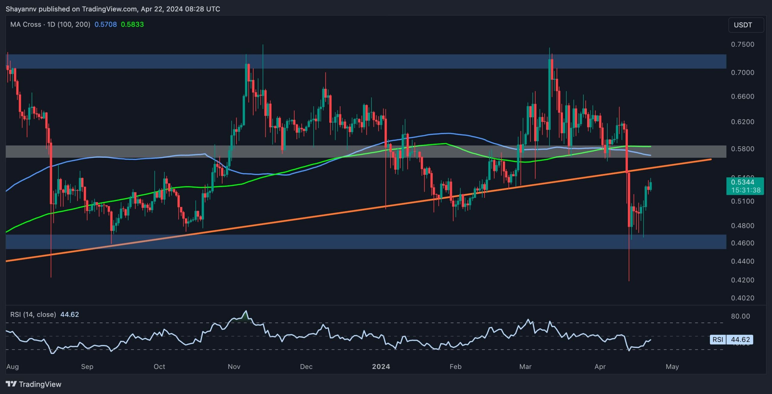 A comprehensive analysis of the daily chart reveals that following a period of consolidation near the pivotal level of $0.45, buyers regained control, sparking a bullish rebound. However, Ripple faces significant resistance ahead, represented by two critical levels: the previously breached ascending trendline at $0.55 and the 100 and 200-day MAs around $0.59.