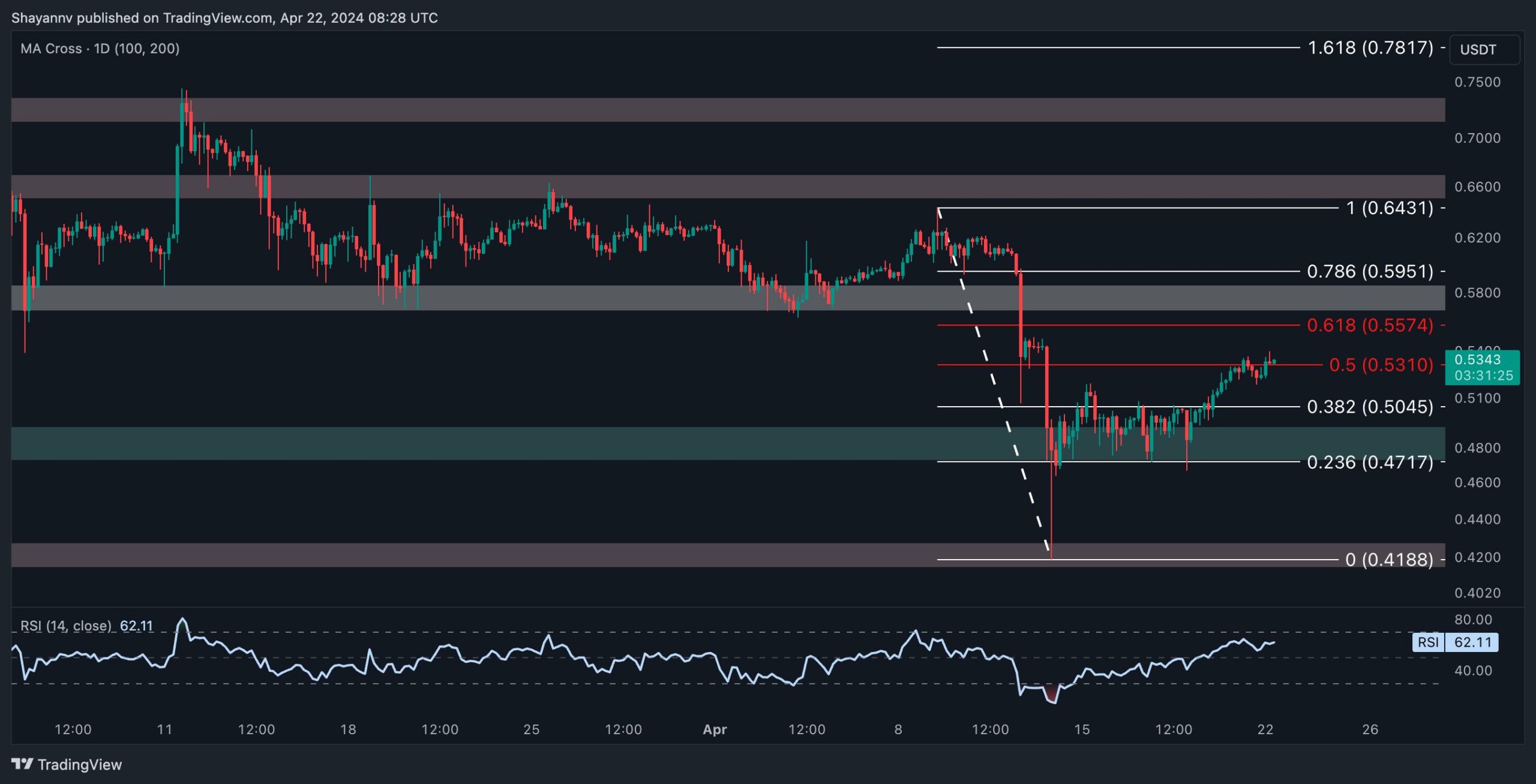 A closer examination of the 4-hour chart reveals that following a notable decline, Ripple stabilized around the $0.50 mark, leading to a period of sideways consolidation. Subsequently, the price gathered bullish momentum and surged towards a significant resistance region delineated by the range between the 0.5 ($0.5310) and 0.618 ($0.5574) Fibonacci levels.