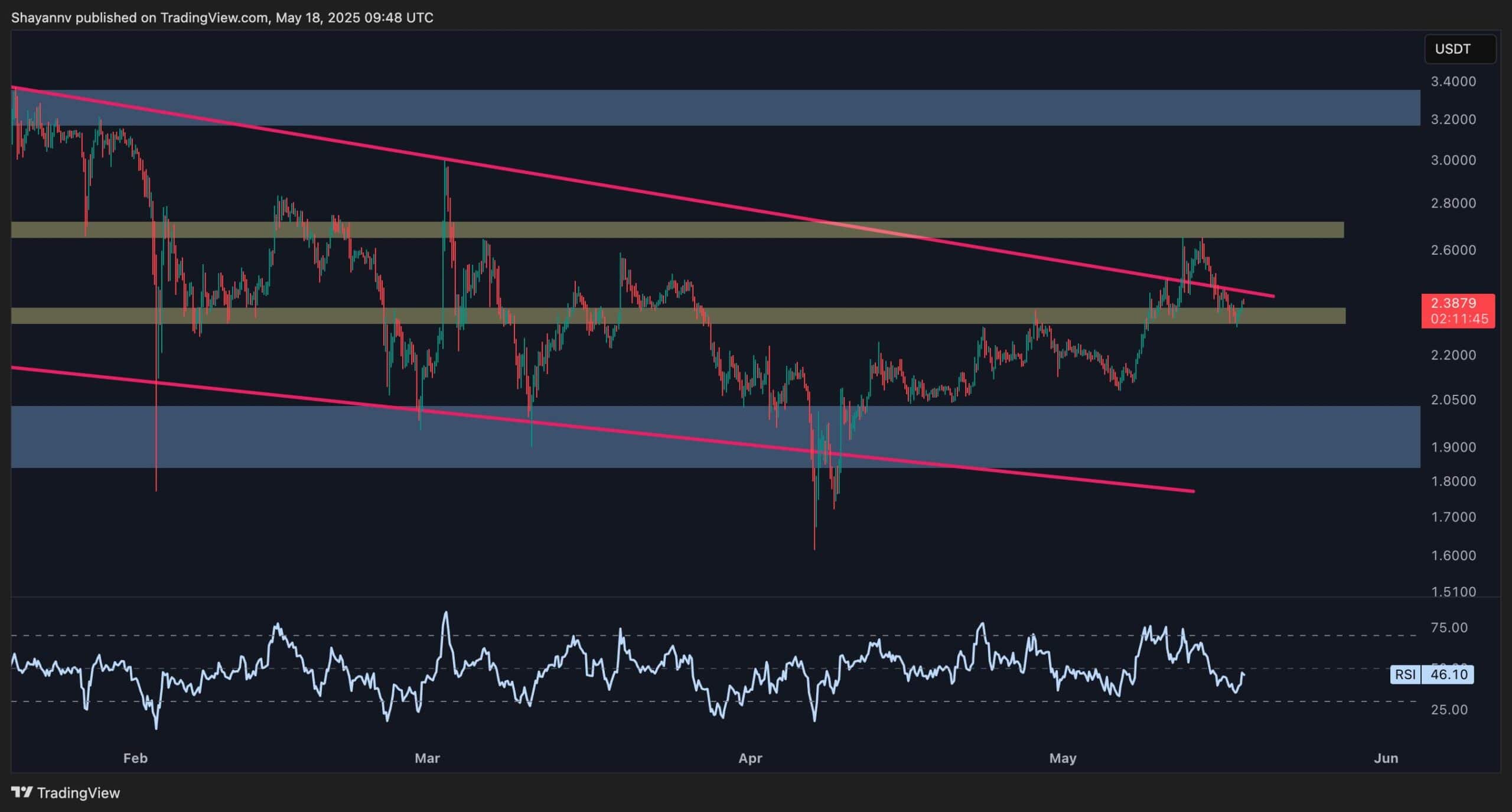 If the breakout is bullish, the price could quickly surge toward the $3.1 resistance. Conversely, a breakdown below $2.3 might trigger a sharp decline toward the $2 support, especially if accompanied by a short-squeeze or panic selling from overleveraged long positions.