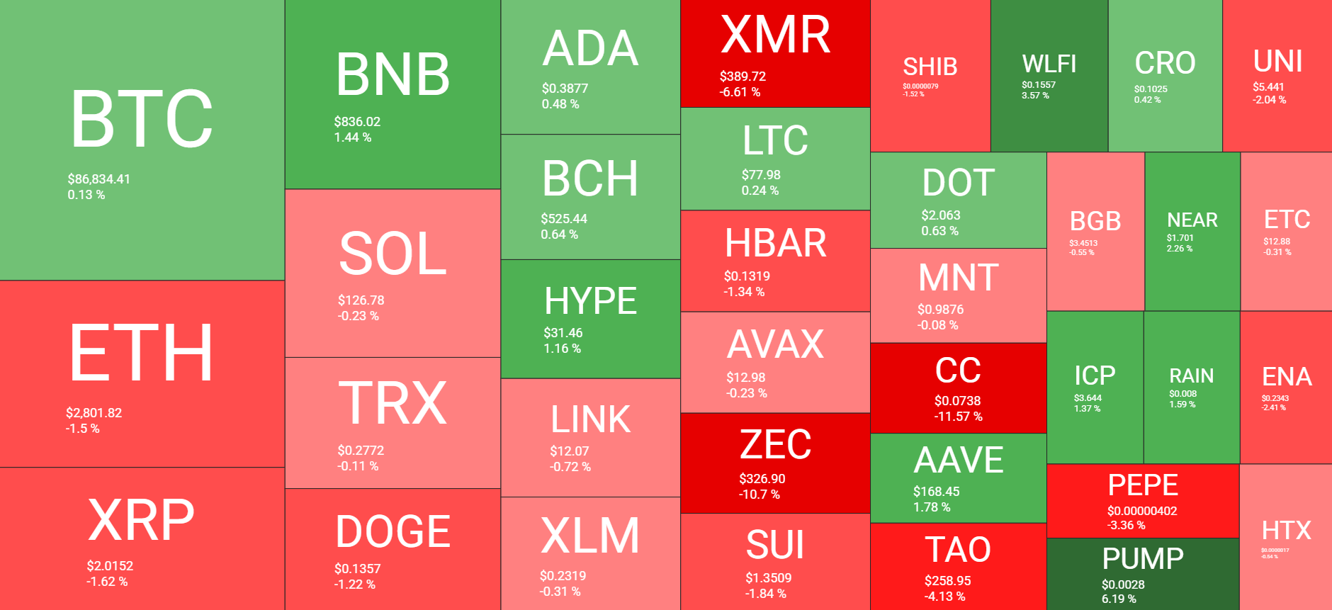The biggest price losses come from ZEC, which has slumped by another 11% daily, CC (down by over 11%), and XMR (6.6% drop to $390). In contrast, PUMP and SKY have gained over 6%, while HASH has rocketed by 14% to $0.023.